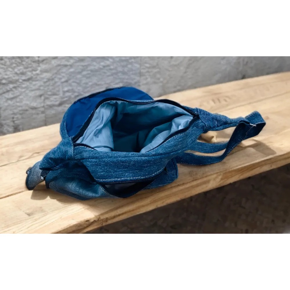 Each of Iguazu’s upcycled denim bags are unique and individual and no two will be the same. As a result of the hand-made process, there will be variations in colour, texture, detail and trim.